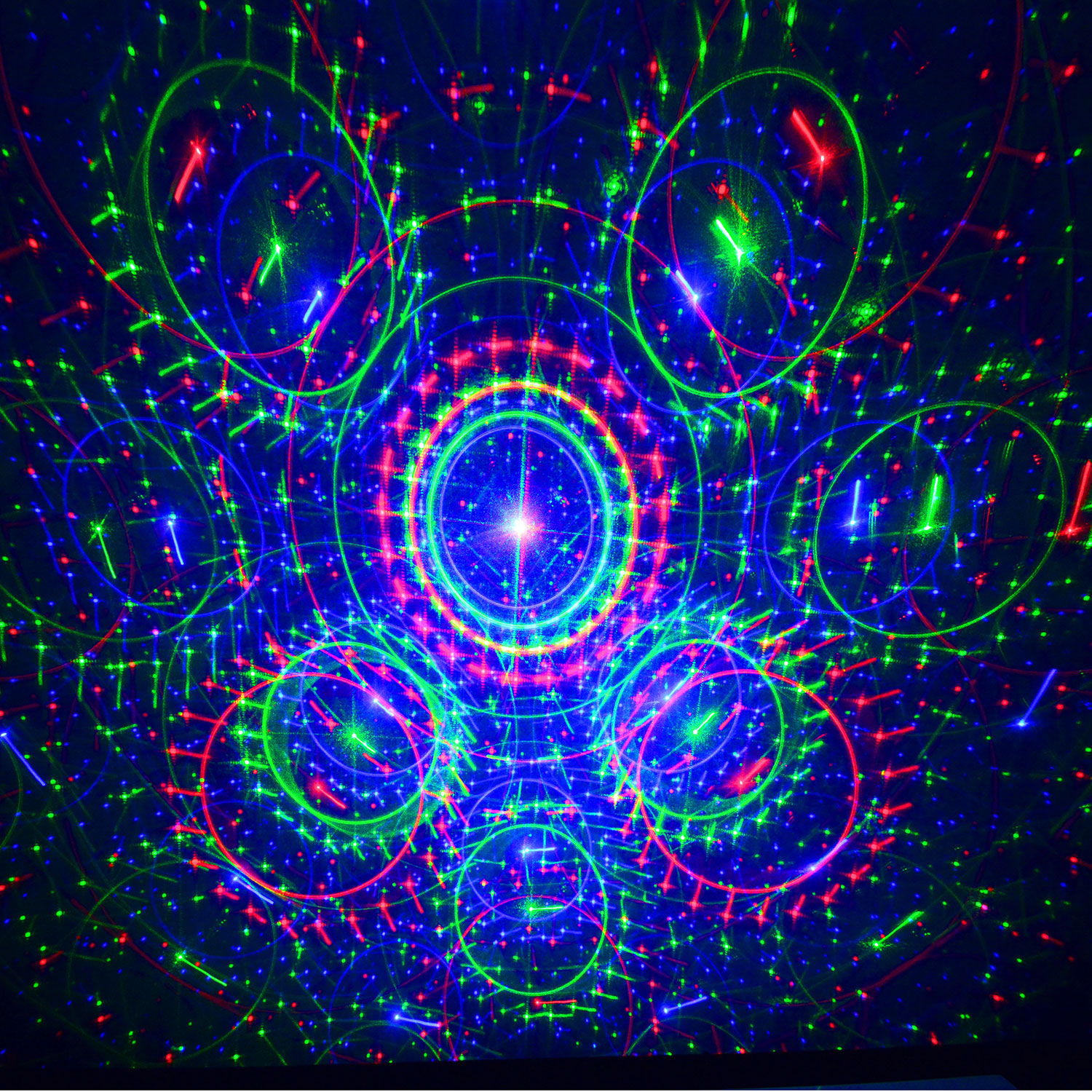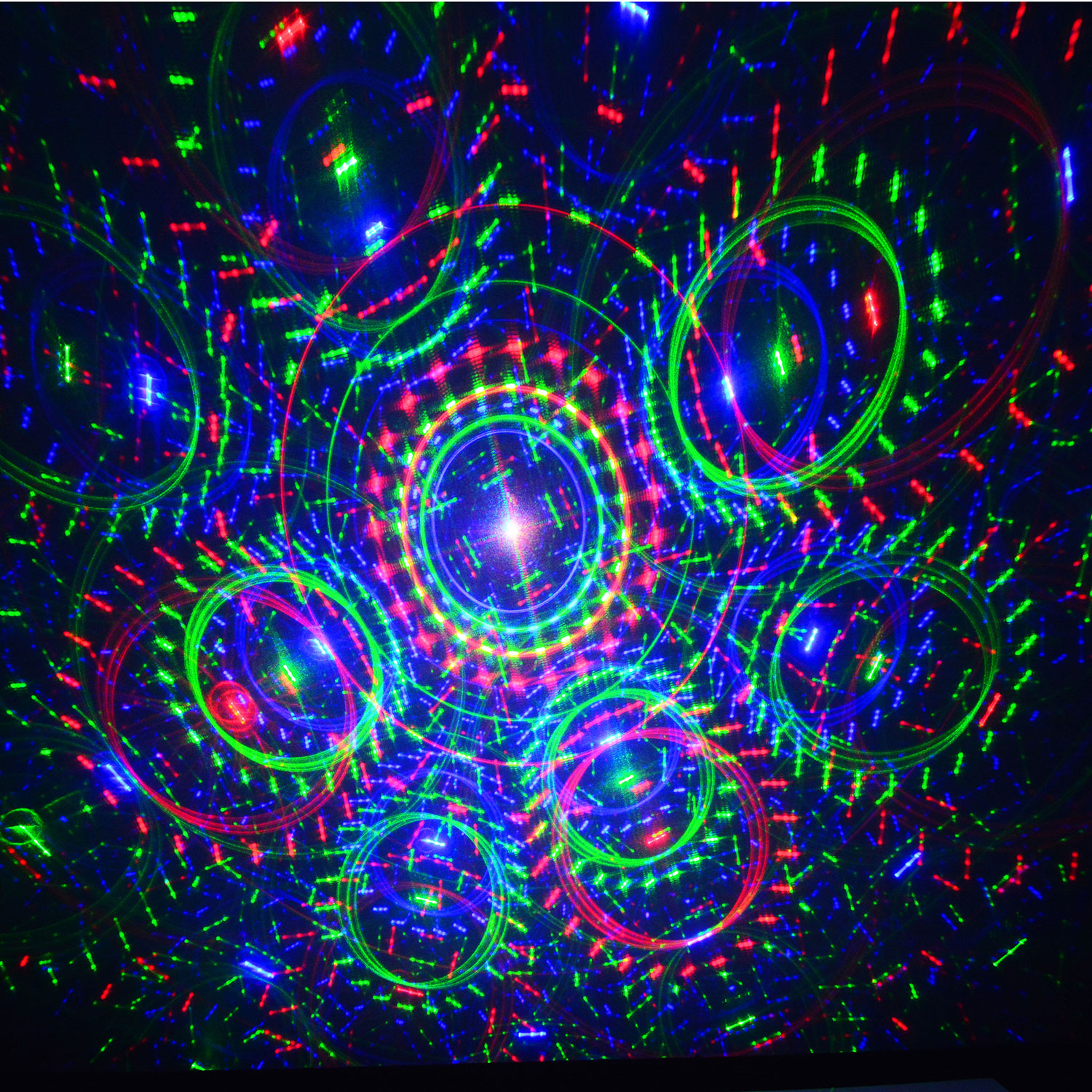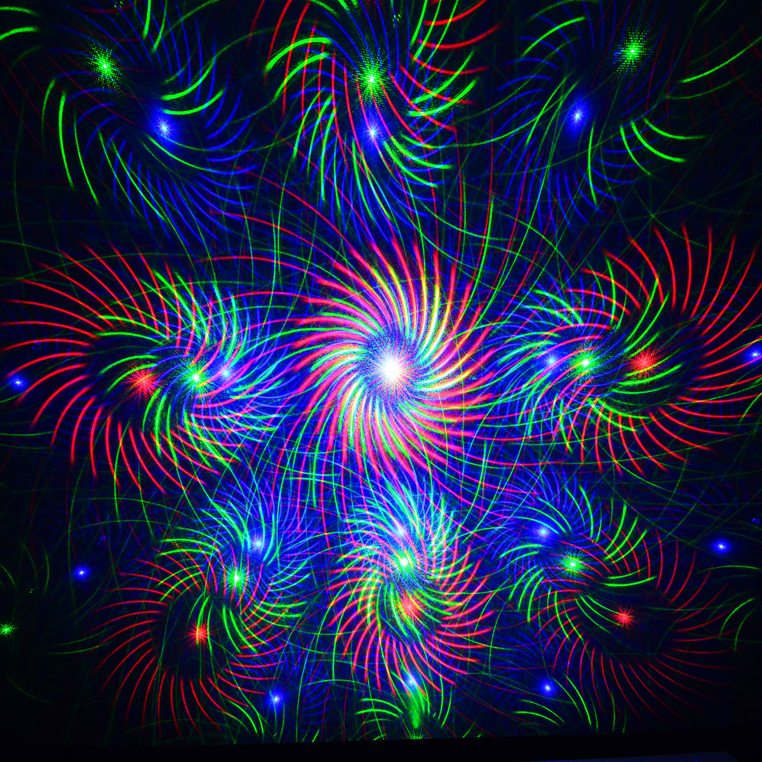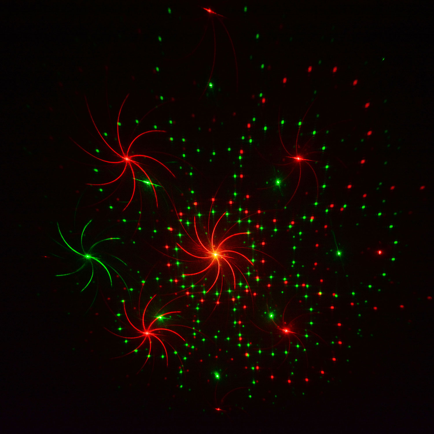 RGB effects laser with multi-point and spiral patterns to produce colourful rotating spiral images. Selectable auto sequence or sound-activated operation with adjustable microphone sensitivity give a choice of operating modes. Projecting against a wall or ceiling produces swirling geometric shapes and when used with fog or haze, a wide cone of moving colourful beams can be picked out to produce an attractive display.