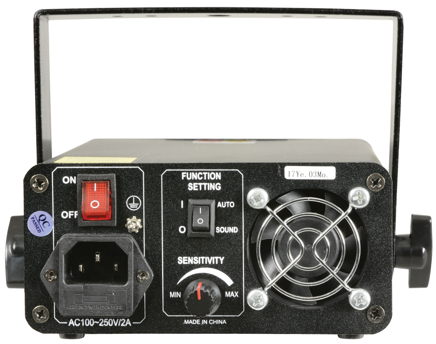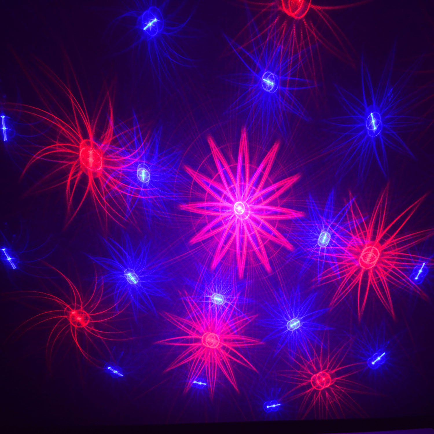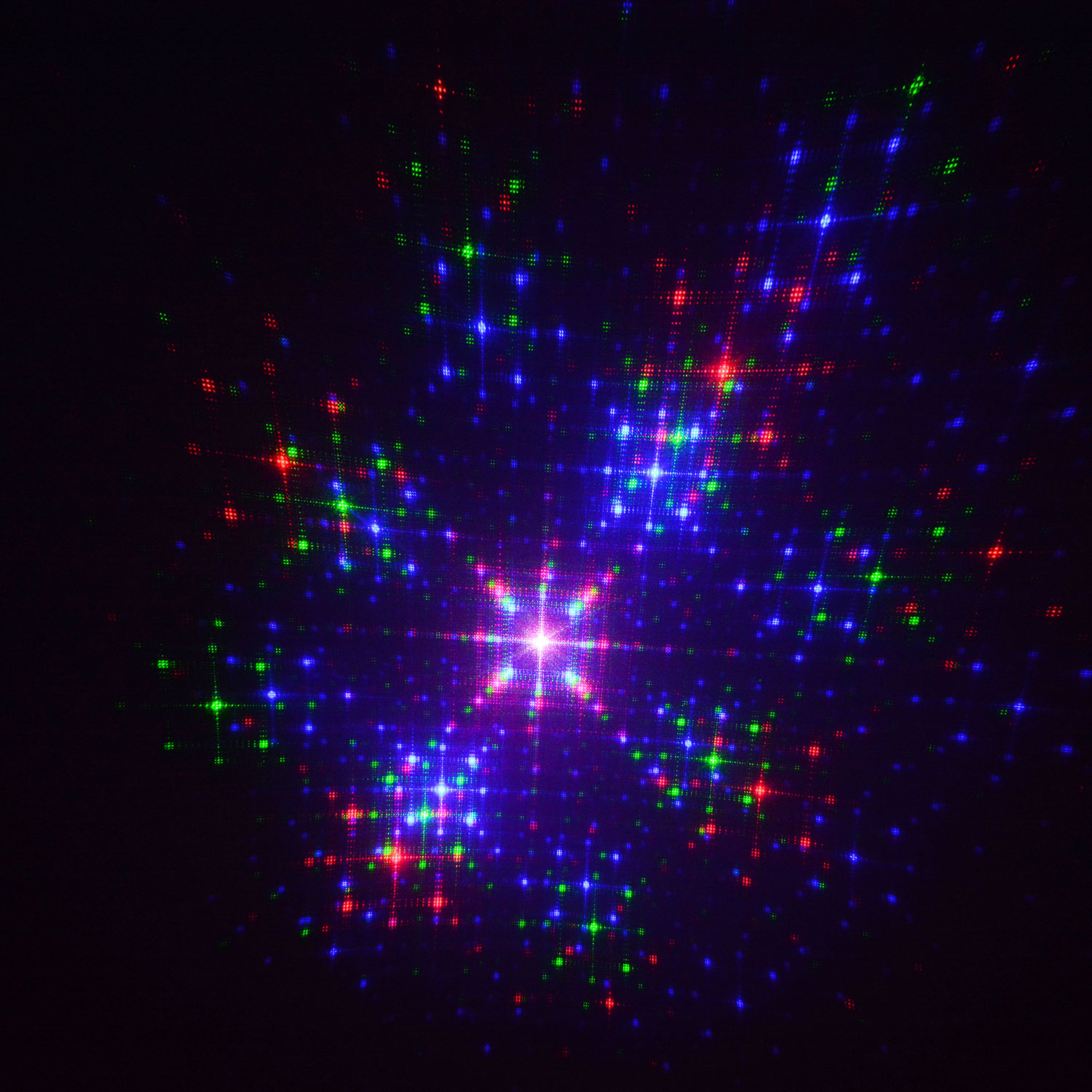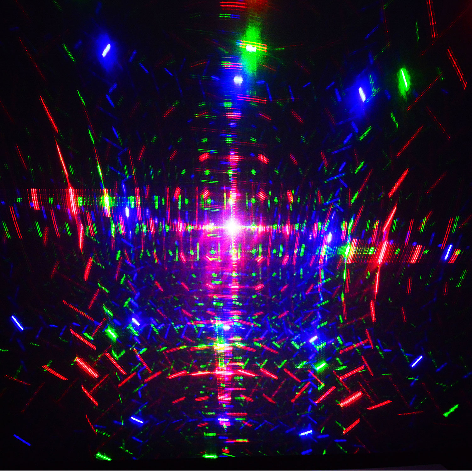 RGB effects laser with multi-point and spiral patterns to produce colourful rotating spiral images. Selectable auto sequence or sound-activated operation with adjustable microphone sensitivity give a choice of operating modes. Projecting against a wall or ceiling produces swirling geometric shapes and when used with fog or haze, a wide cone of moving colourful beams can be picked out to produce an attractive display.
