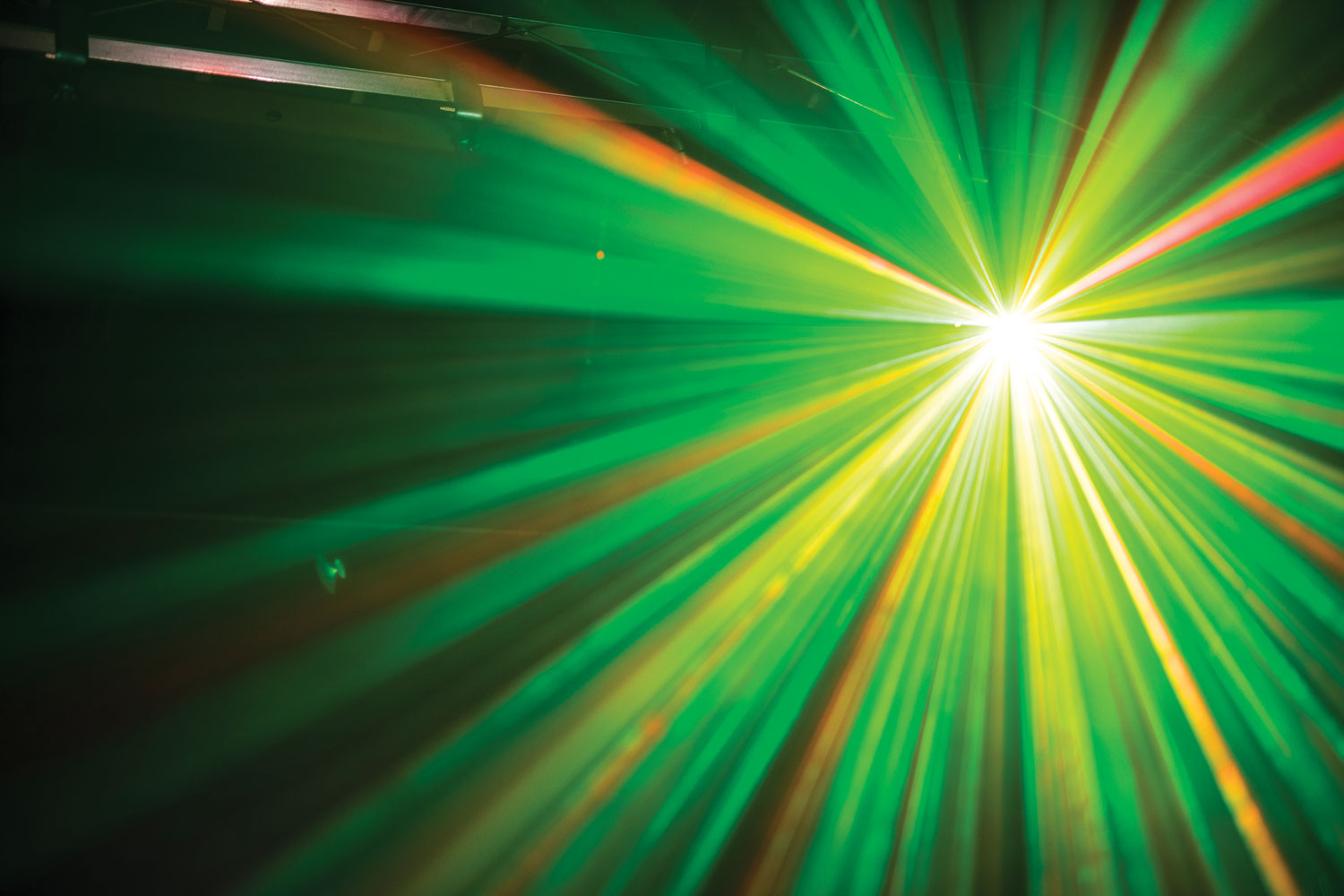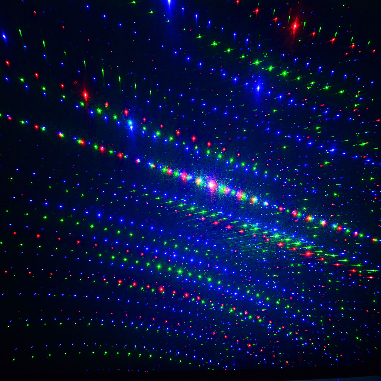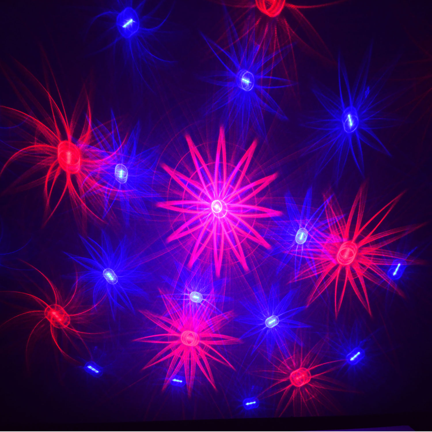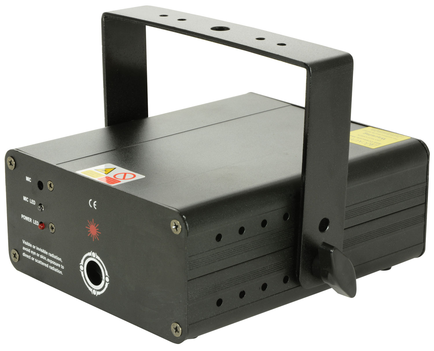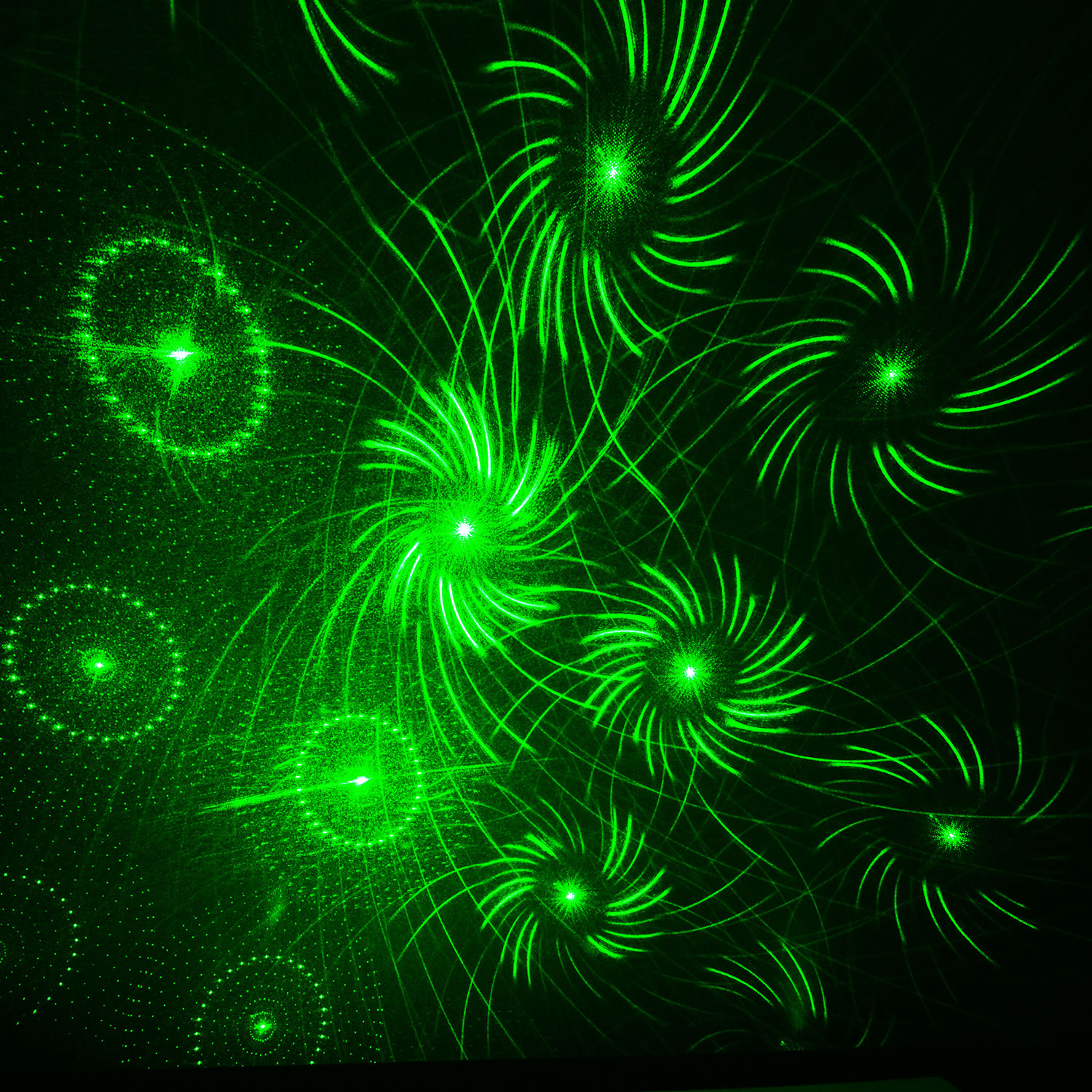 RGB effects laser with multi-point and spiral patterns to produce colourful rotating spiral images. Selectable auto sequence or sound-activated operation with adjustable microphone sensitivity give a choice of operating modes. Projecting against a wall or ceiling produces swirling geometric shapes and when used with fog or haze, a wide cone of moving colourful beams can be picked out to produce an attractive display.