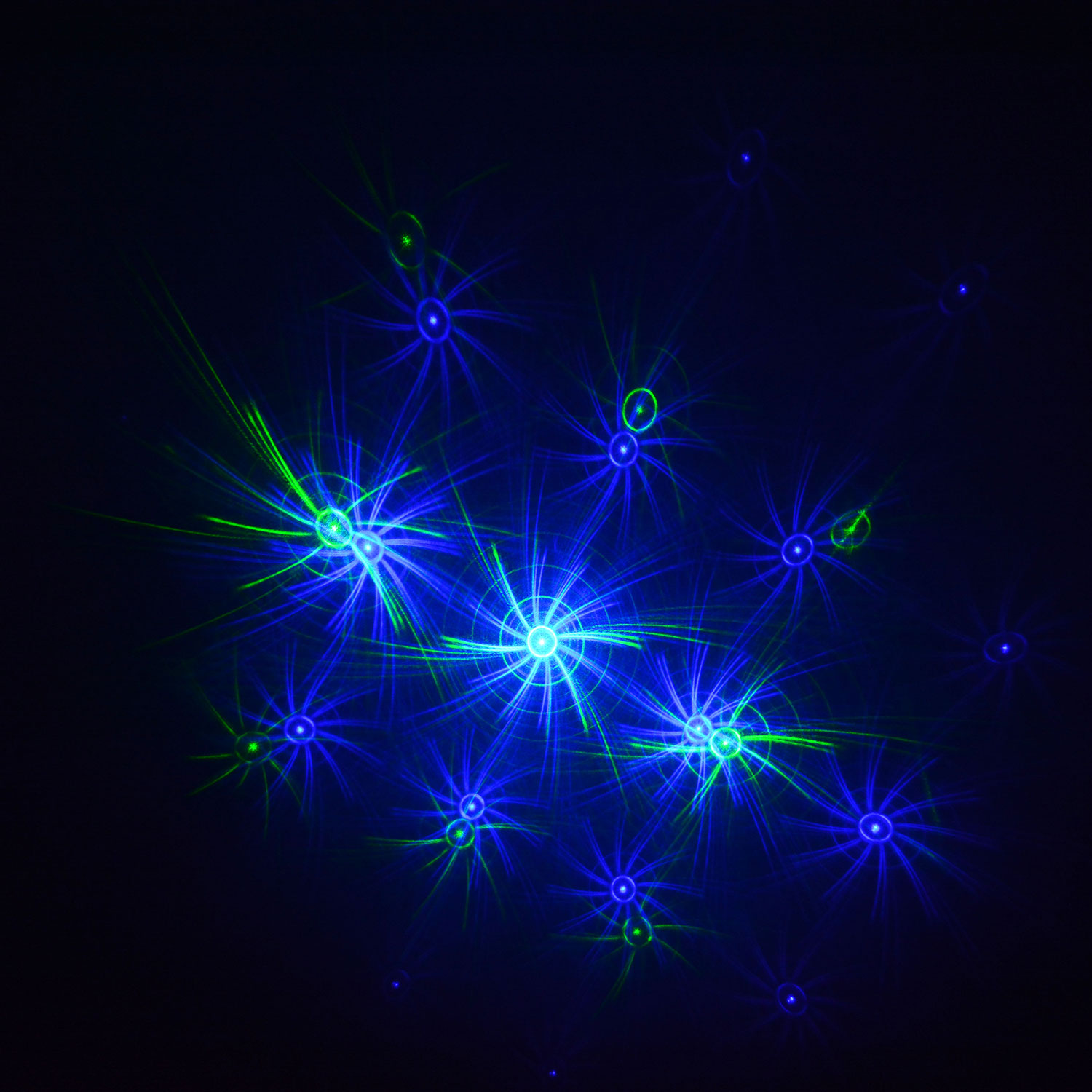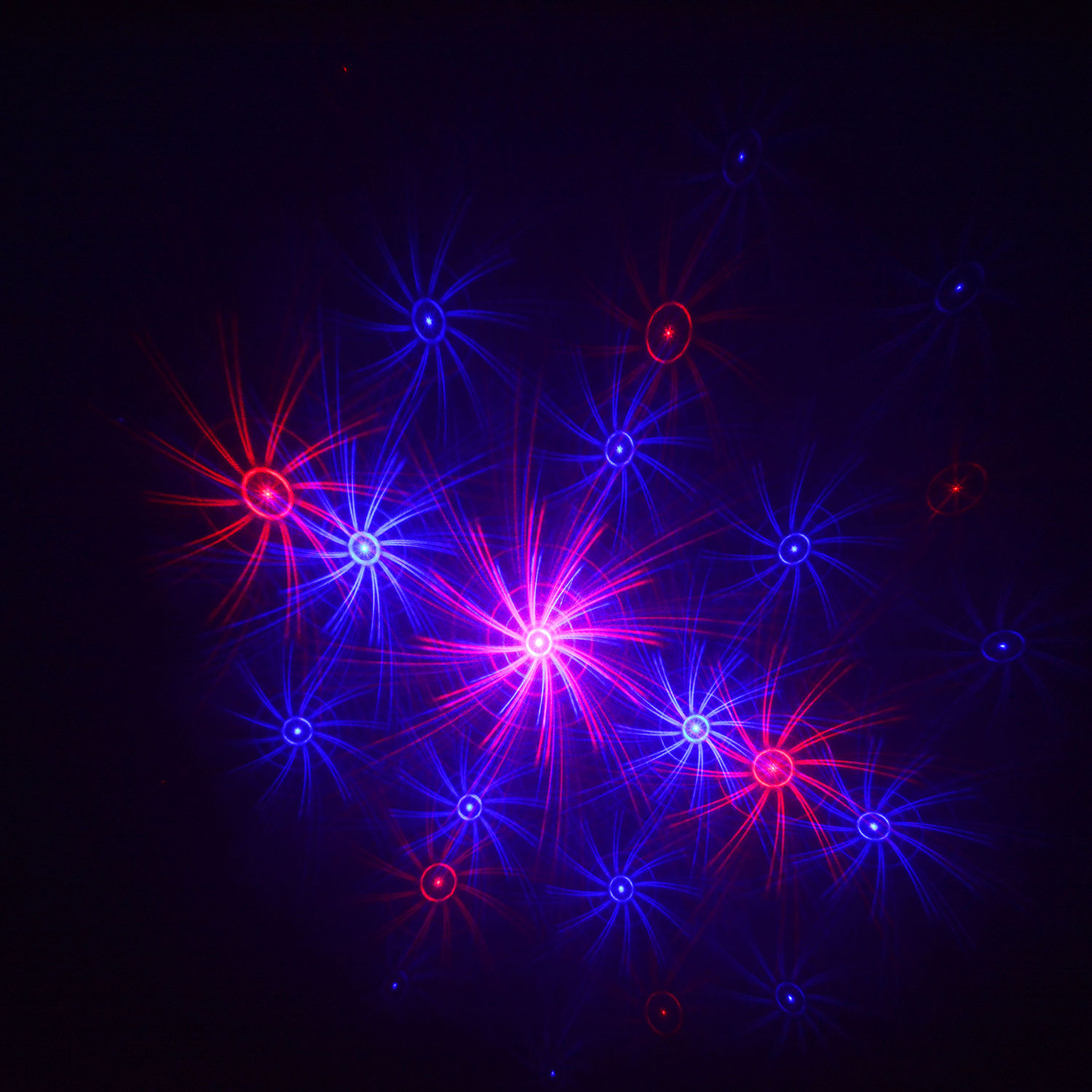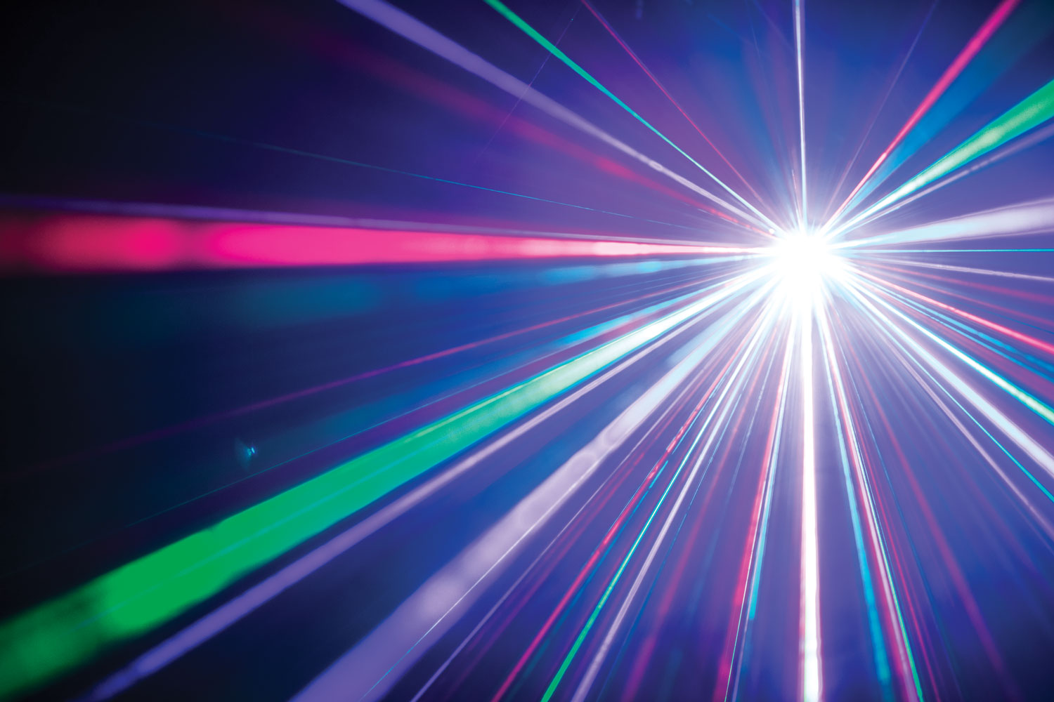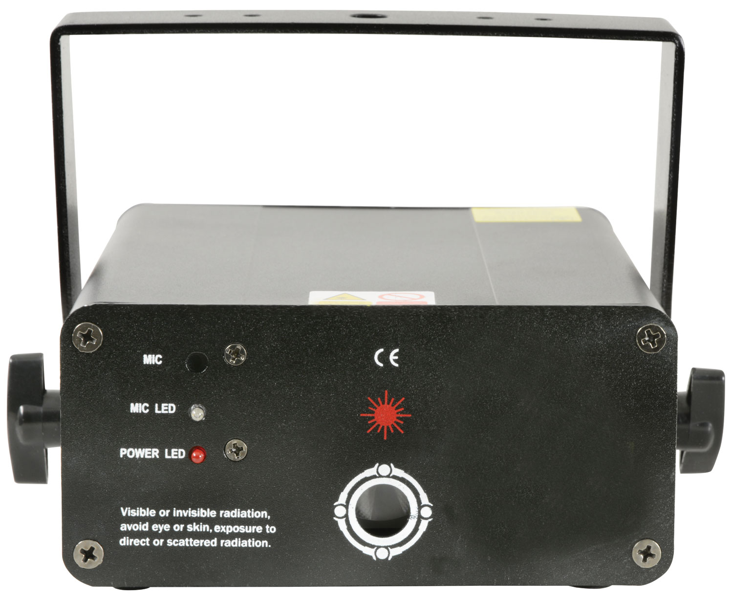 RGB effects laser with multi-point and spiral patterns to produce colourful rotating spiral images. Selectable auto sequence or sound-activated operation with adjustable microphone sensitivity give a choice of operating modes. Projecting against a wall or ceiling produces swirling geometric shapes and when used with fog or haze, a wide cone of moving colourful beams can be picked out to produce an attractive display.