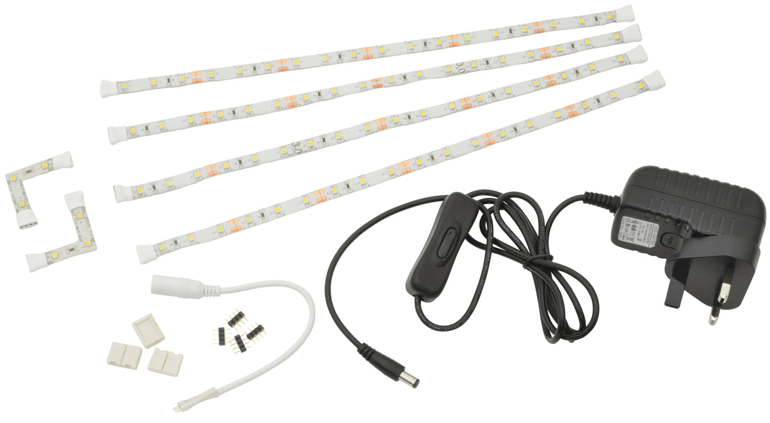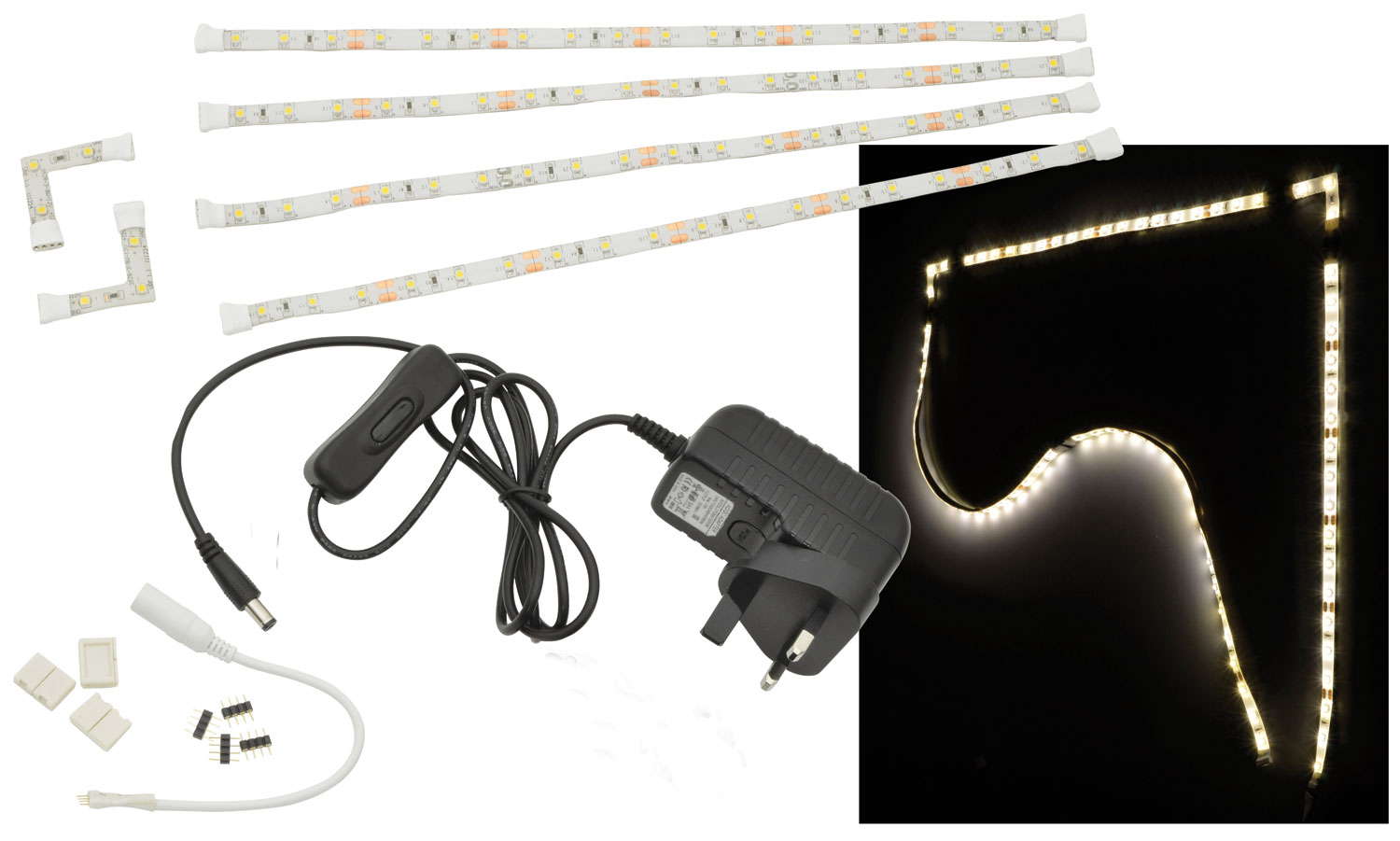 DIY LED tape installation kits comprising 4 lengths of self adhesive LED tape with two 90° corner pieces and a 12Vdc power supply with an in-line switch. The tape can be cut to size and re-joined to fit different sizes of trim or frames using the supplied snap-on connectors. The kit offers straightforward LED tape installation without requiring special tools or skills.