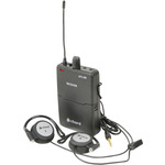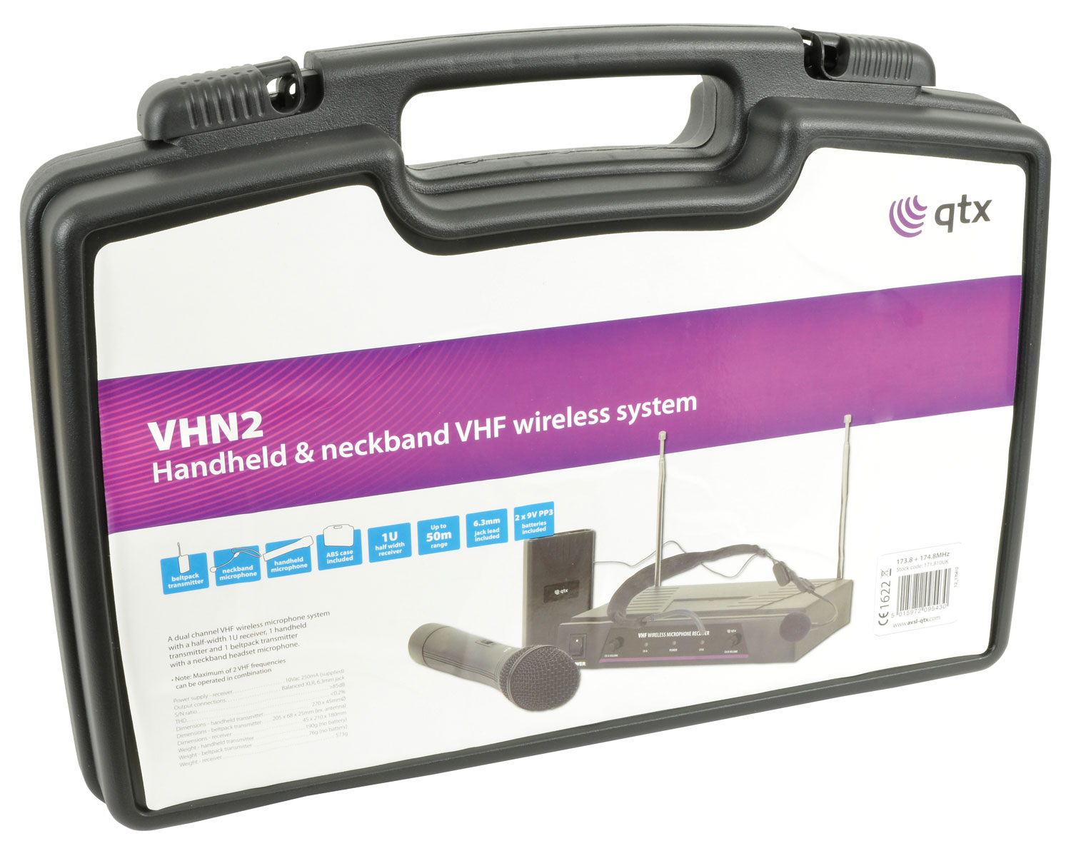 A dual channel VHF wireless microphone system with a half-width 1U receiver, 1 handheld transmitter and 1 beltpack transmitter with a neckband headset microphone.
