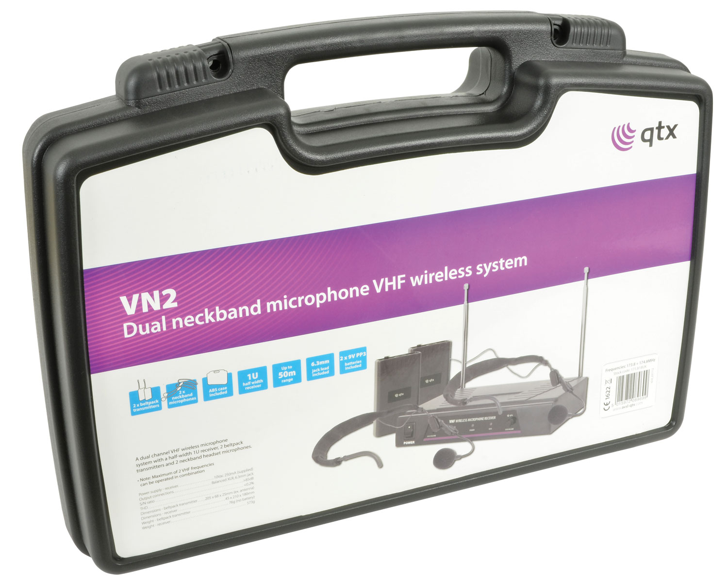 A dual channel VHF wireless microphone system with a half-width 1U receiver, 2 beltpack transmitters and 2 neckband headset microphones.