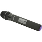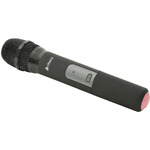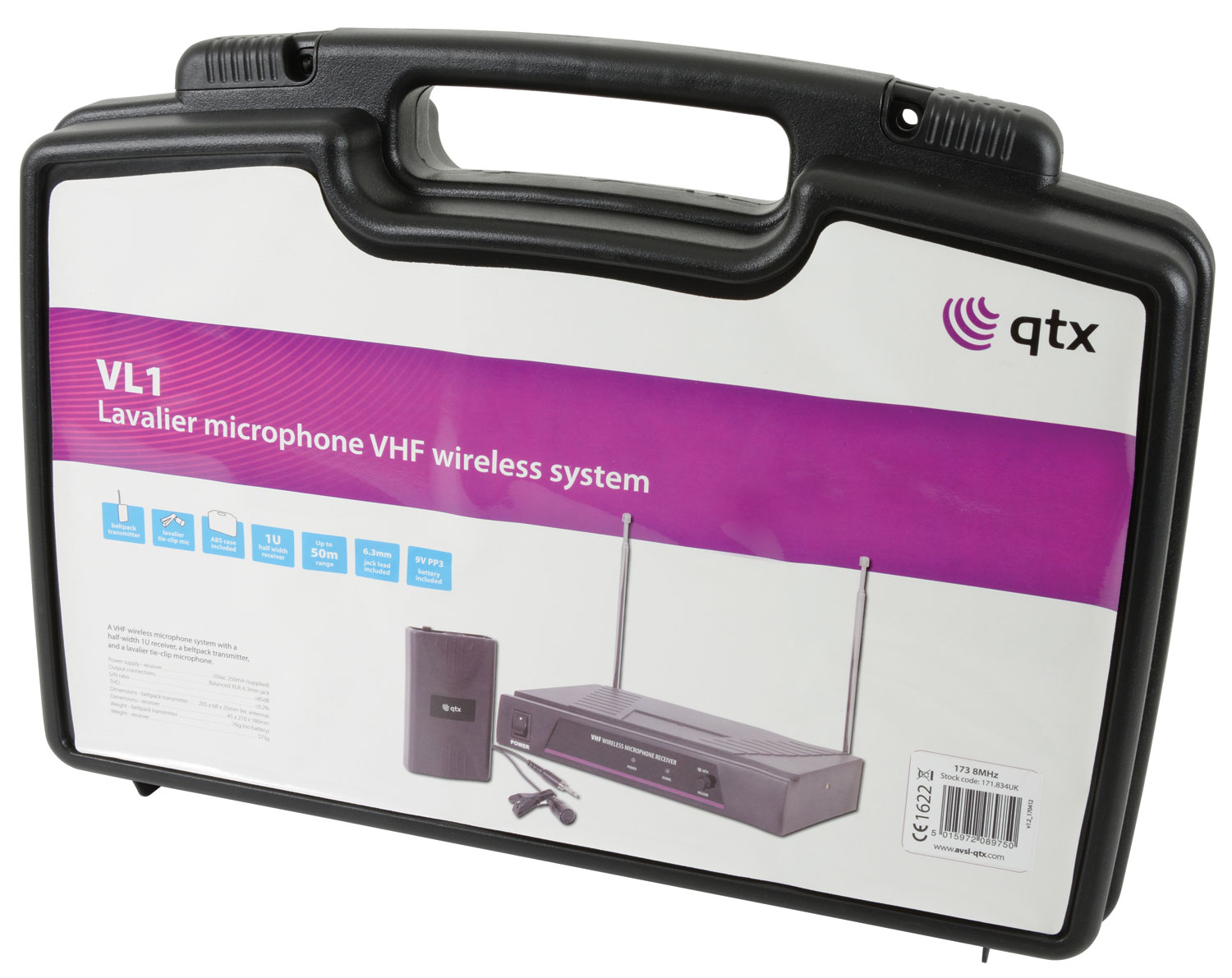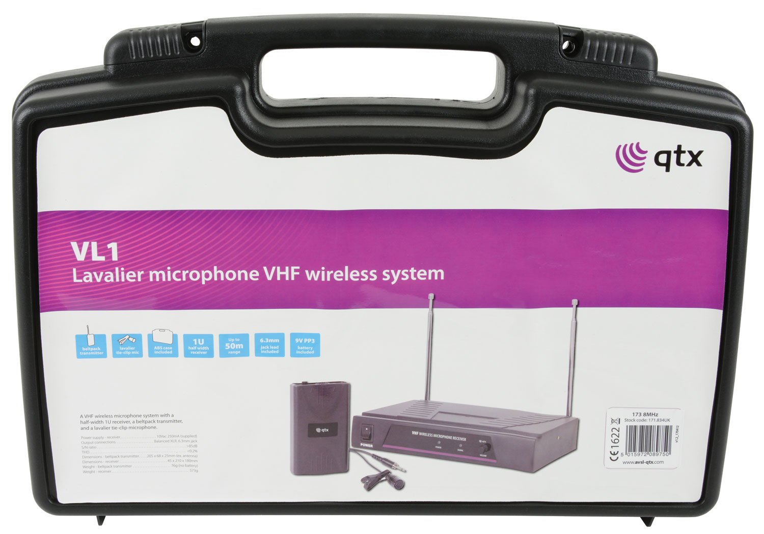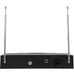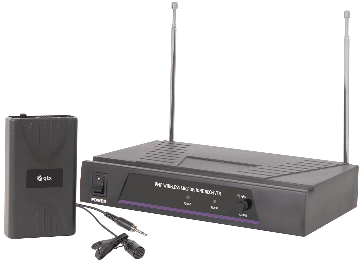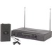 A VHF wireless microphone system with a half-width 1U receiver, a beltpack transmitter, and a lavalier tie-clip microphone.