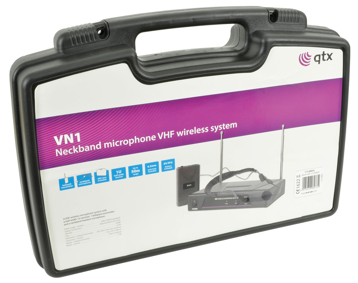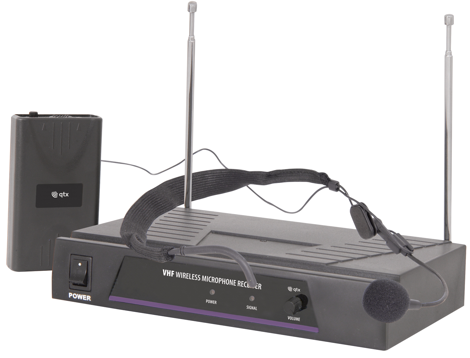 A VHF wireless microphone system with a half-width 1U receiver, 1 beltpack transmitter and a neckband headset microphone.