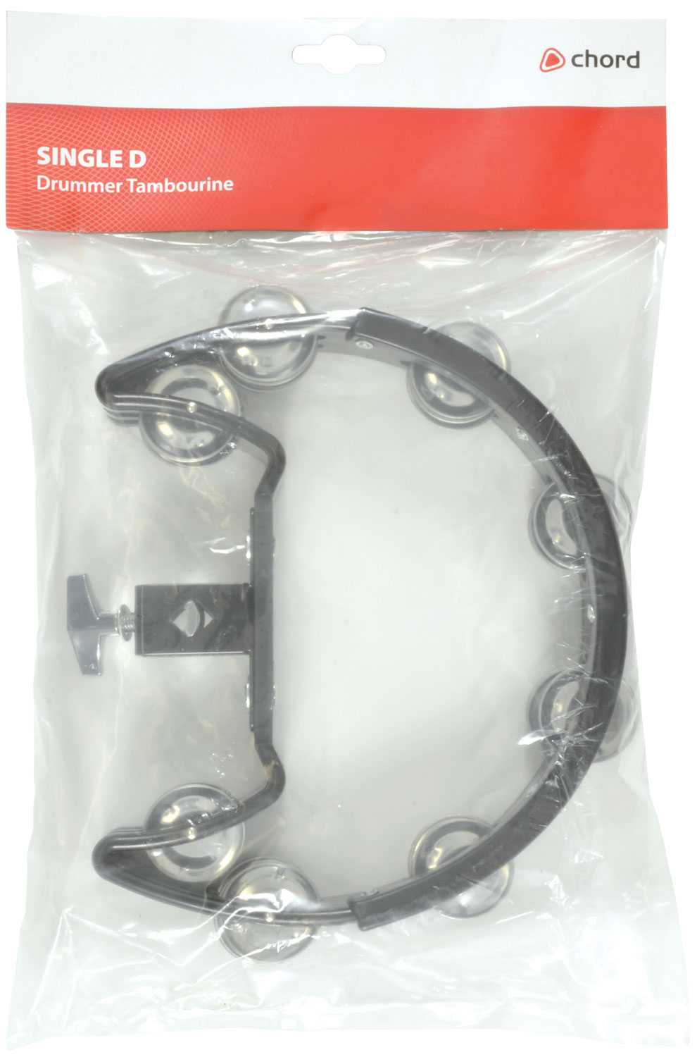 Single D tambourine in black plastic with integral clamp and reinforced striking edge for mounting over hi-hats or to a cymbal stand.