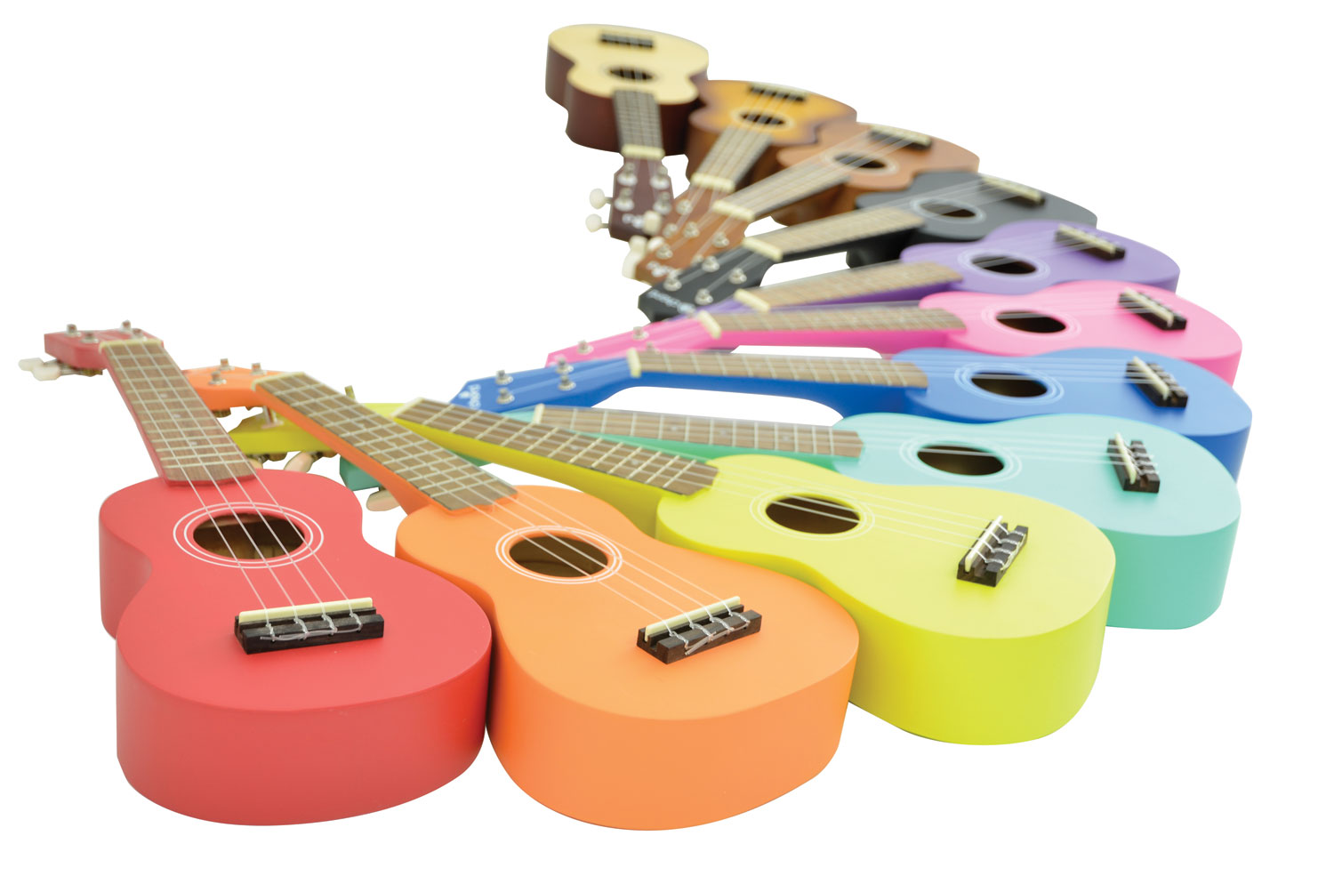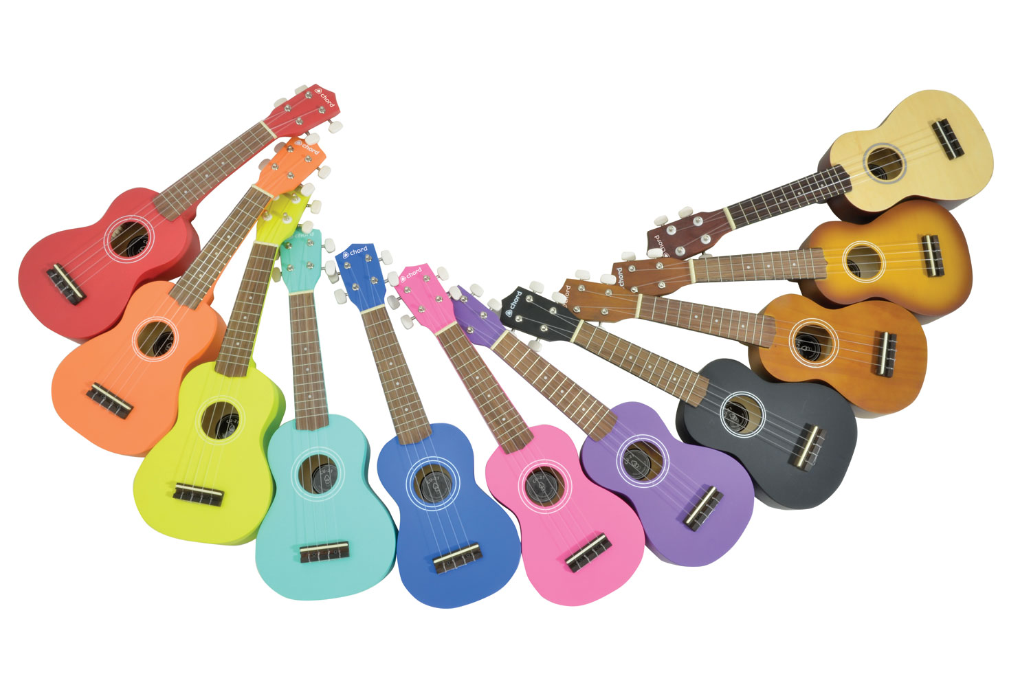 Soprano ukulele with linden top, back, sides and neck with 12 fret fingerboard. Finish is stained or solid colour and fitted with nylon strings, tuned via 4 geared machine heads.