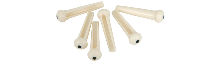 Set of 6 replacement plastic bridge pins for steel strung acoustic guitar. Available as black with white dot or white with black dot.