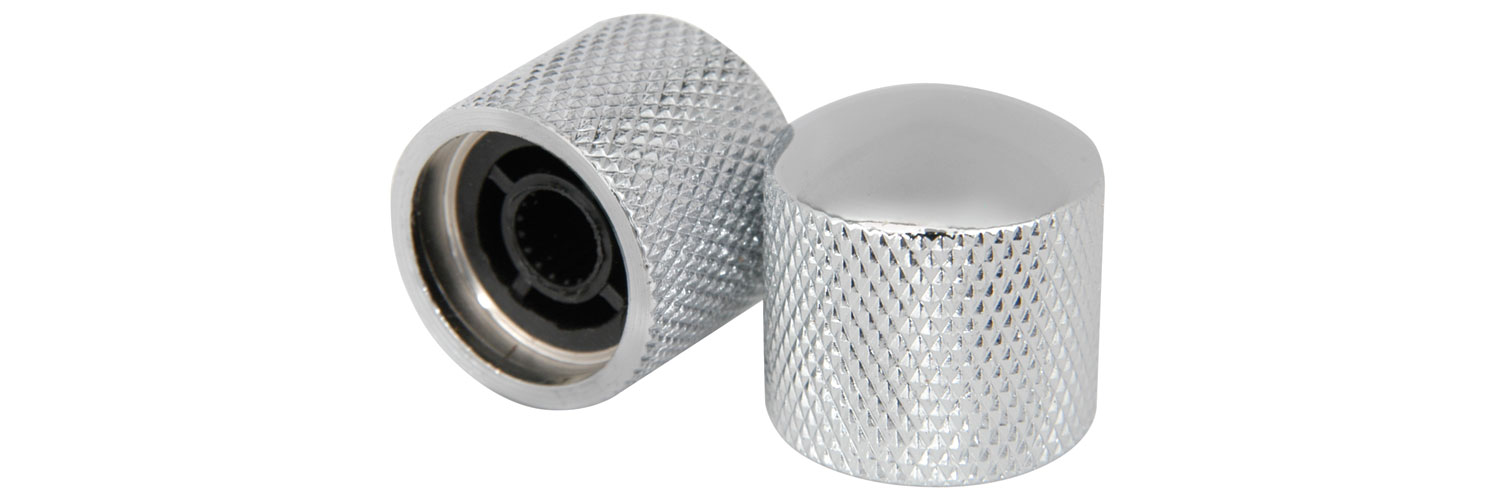 Set of 2 replacement control knobs for CAL62 style and other electric guitars. Plated knurled metal dome is formed over a plastic push-fit design body.