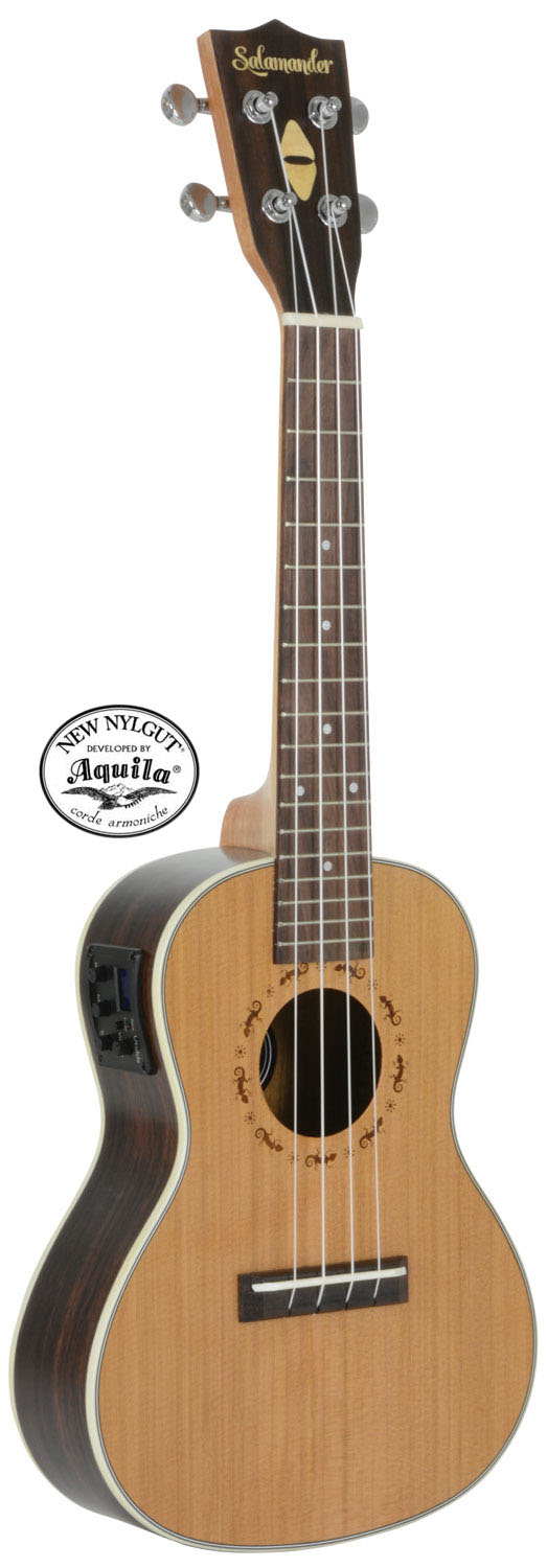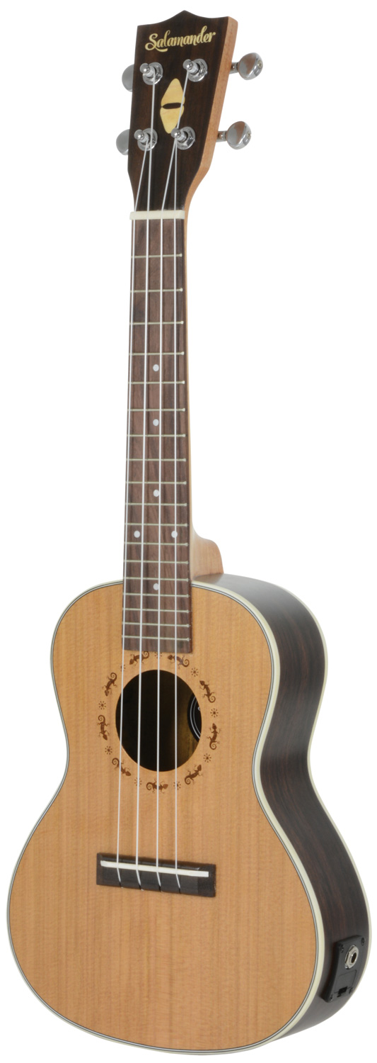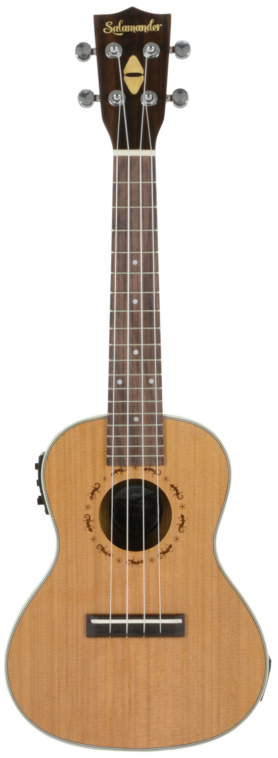 These Salamander electro-acoustic ukuleles are made from a solid cedar top and bound walnut back and sides for a warm, resonant sound. A clear satin finish protects the tone-woods without restricting vibration. Also features an under-saddle piezo pickup and 2-band EQ/tuner.