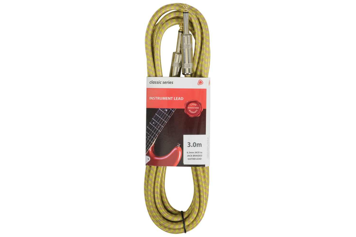 A range of 6.3mm jack instrument or signal leads with outer nylon braid in various colour combinations. In addition to the retro styling, the braid gives added protection to the cable and helps to avoid kinks or tangling when coiled.