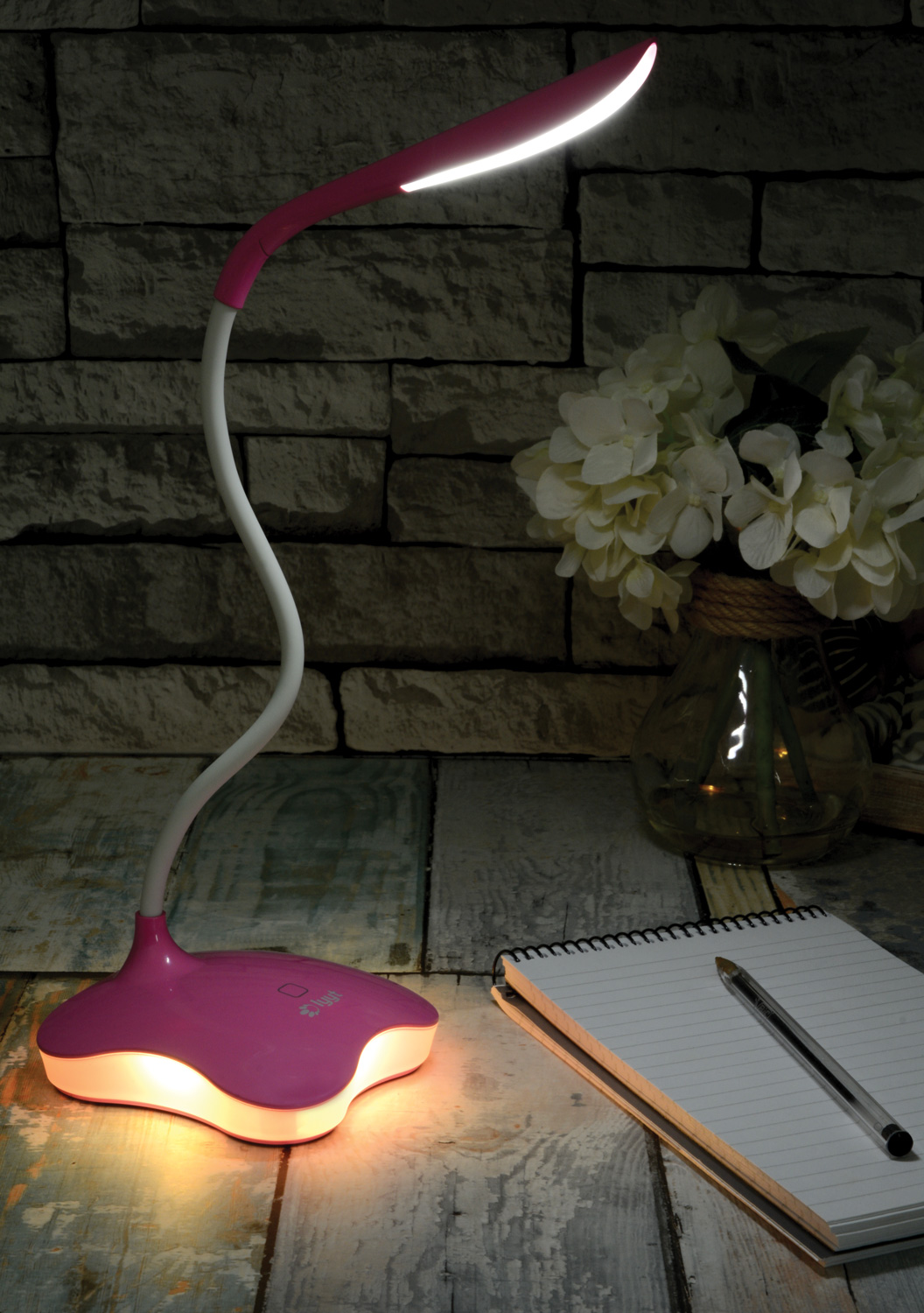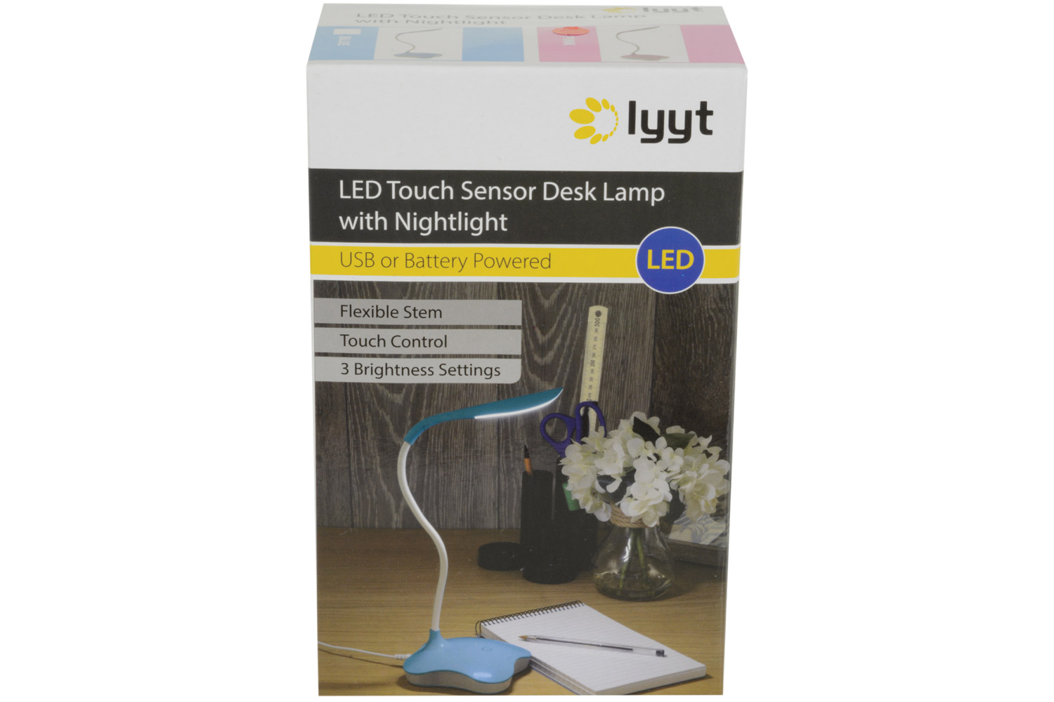 LED Touch Sensor desktop lamp with 3 brightness settings and a soothing nightlight that can be either USB or battery powered. It's flexible stem directs the light into any position.