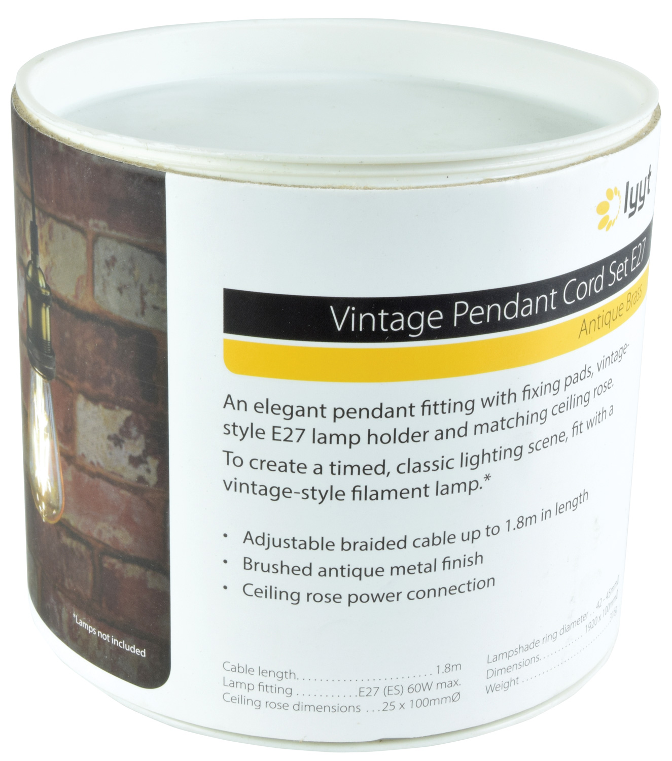 Decorative cord sets comprising an E27 lamp holder with plated aluminium cover, plated steel ceiling rose with internal terminal block and a 1.8m nylon braided mains cable, which can be cut to length and re-connected in the ceiling rose as required. Install with vintage style LED filament lamps to create a retro-style lighting scheme.