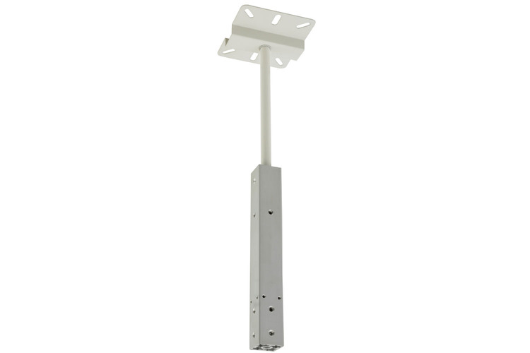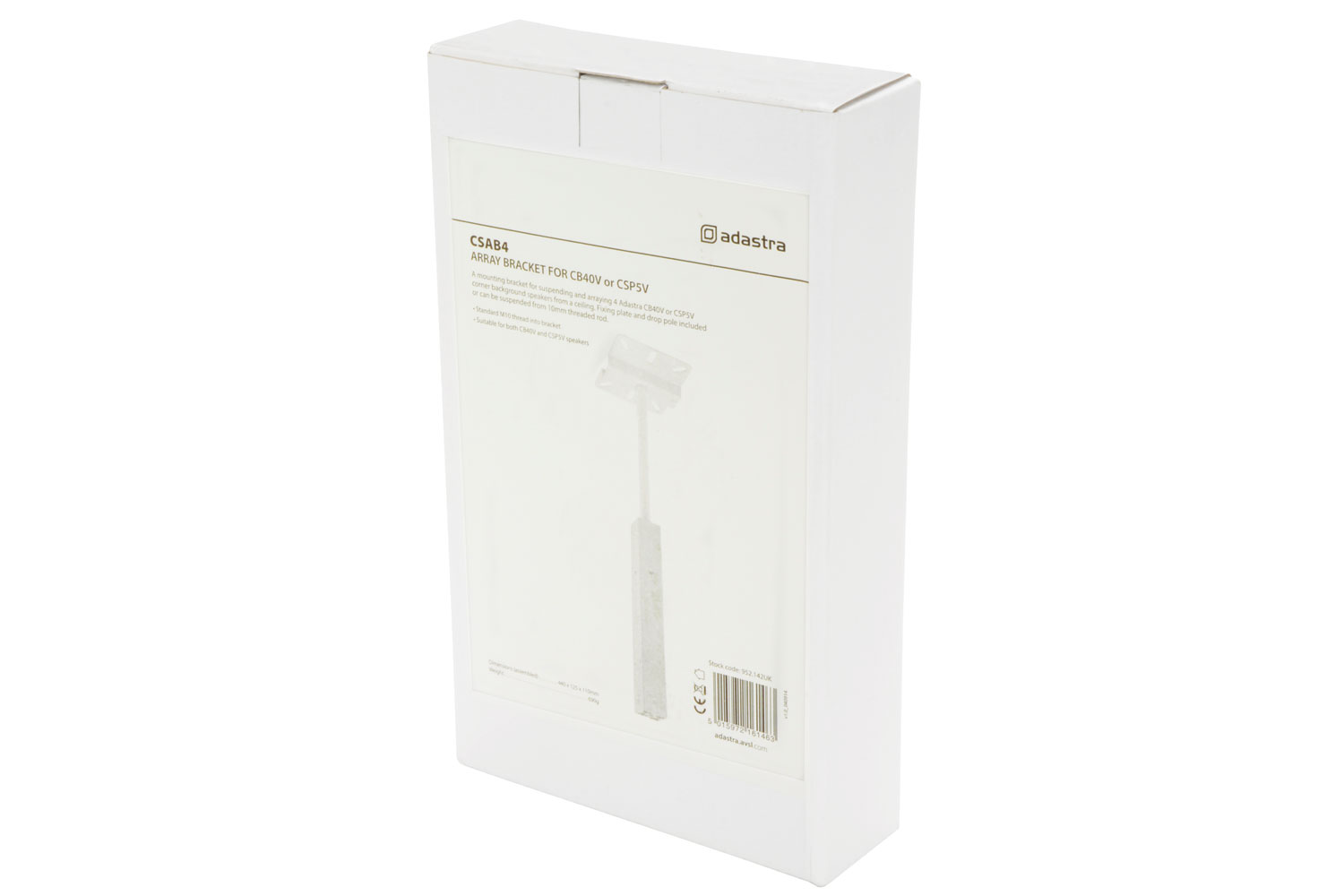 A mounting bracket for suspending and arraying 4 Adastra CB40V corner background speakers from a ceiling. Fixing plate and drop pole included or can be suspended from 10mm threaded rod.
